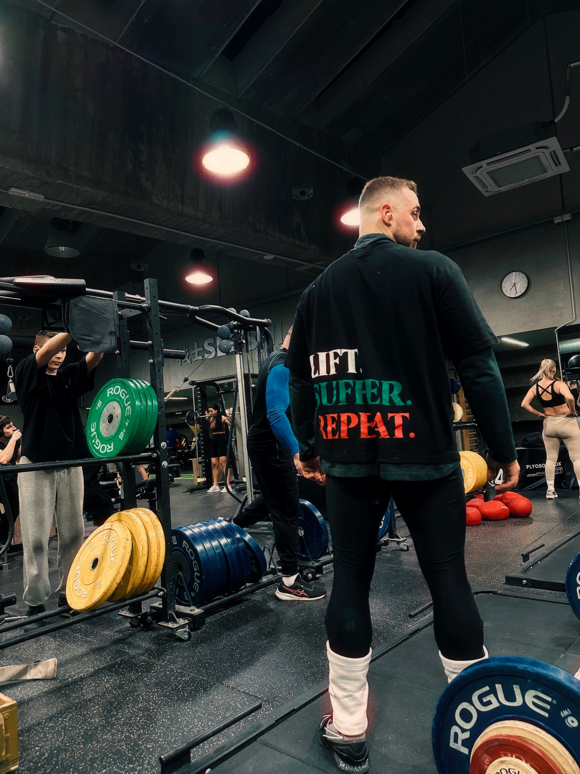 Der Backprint in Weiß, Grün und Rot – den Farben der bulgarischen Flagge – symbolisiert die rohe, ehrliche Krafttradition des osteuropäischen Gewichthebens.